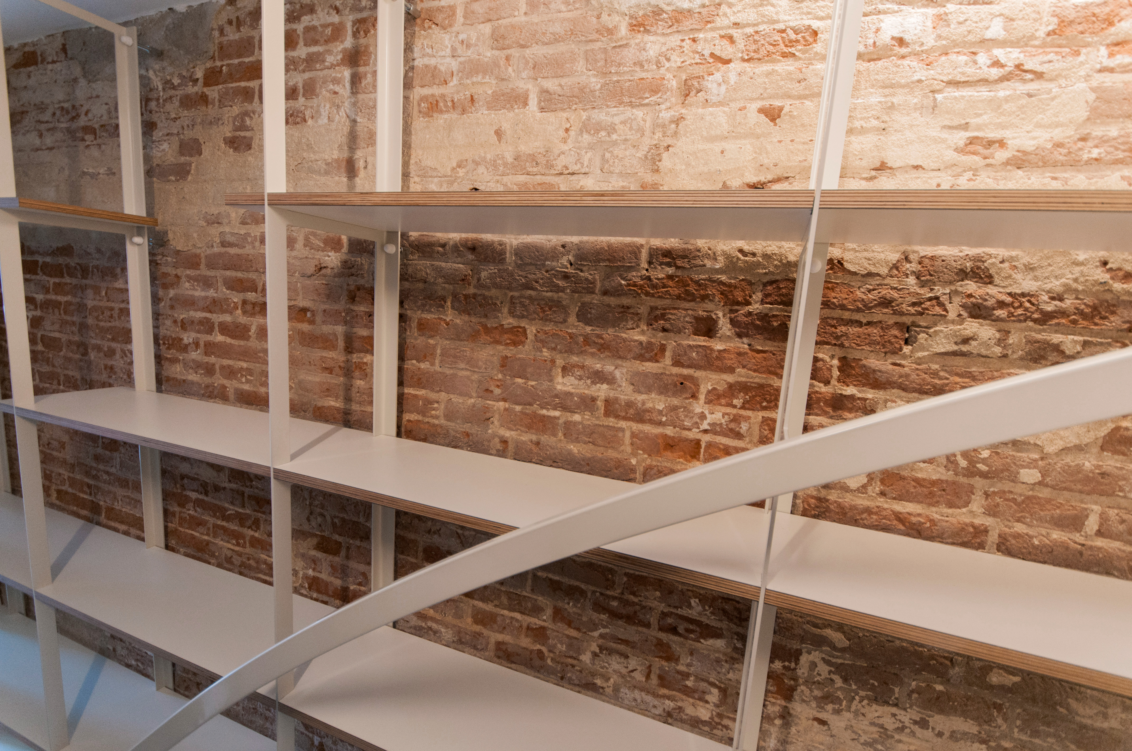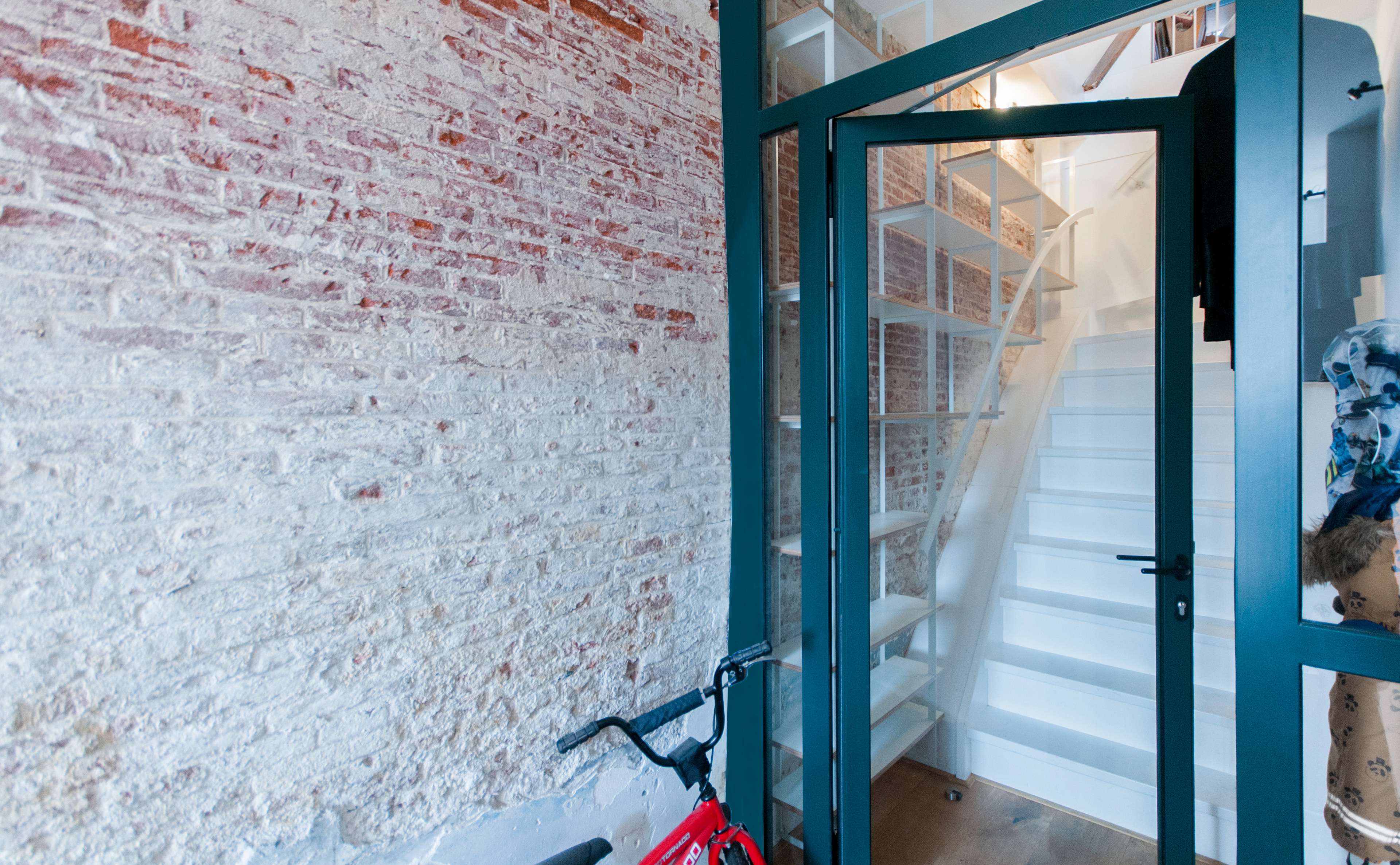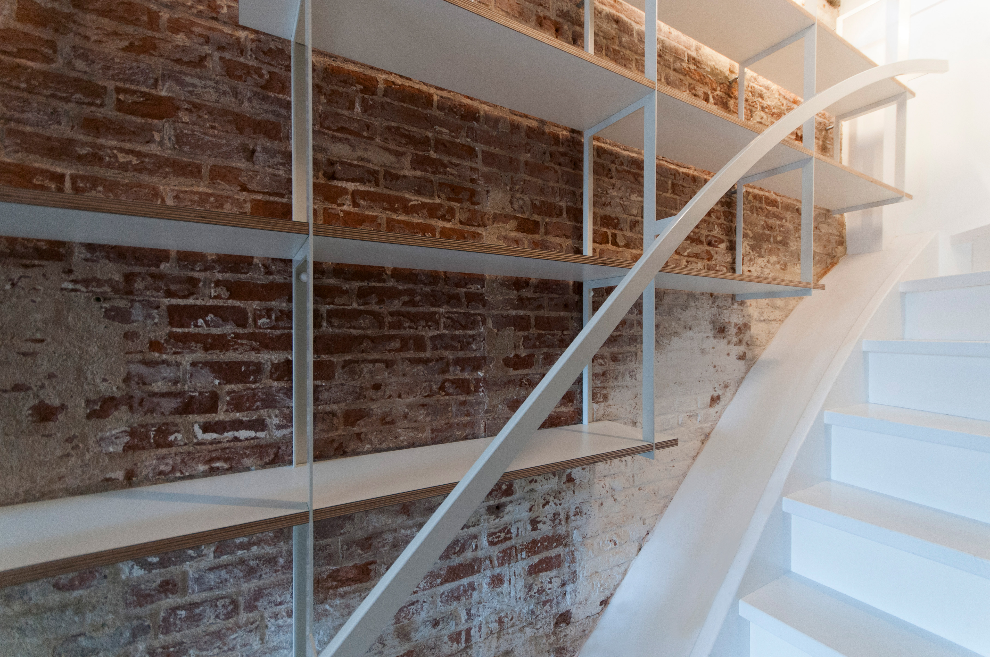 Tegen de originele (scheve) bakstenen binnenmuur hebben we een transparante kast en leuning ontworpen uit gecoat plaatstaal en liggers van gelamineerd multiplex. De gebogen stalen leuning is onderdeel van de constructie. De losse delen hebben een genadeloze marge. Alles moest tot op de mm. exact worden voorbereid om uiteindelijk te passen. Soms durven we dat wel aan. De kast zal hoofdzakelijk met schoenen gevuld worden.