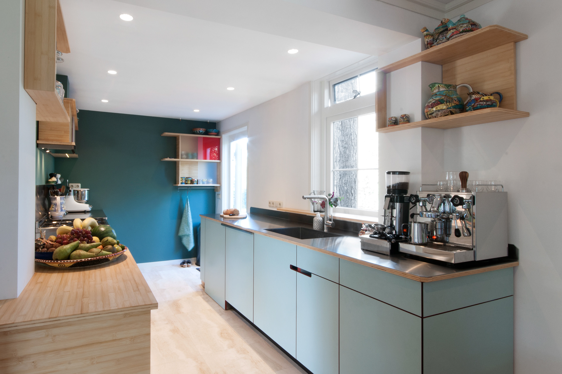 Hét gezicht van de keuken is wel het subtiele greep detail, een eenvoudige uitsparing in de fronten. Materialen zijn: RVS, Bamboo, HPL op berken multiplex en rompen van wit betonplex.