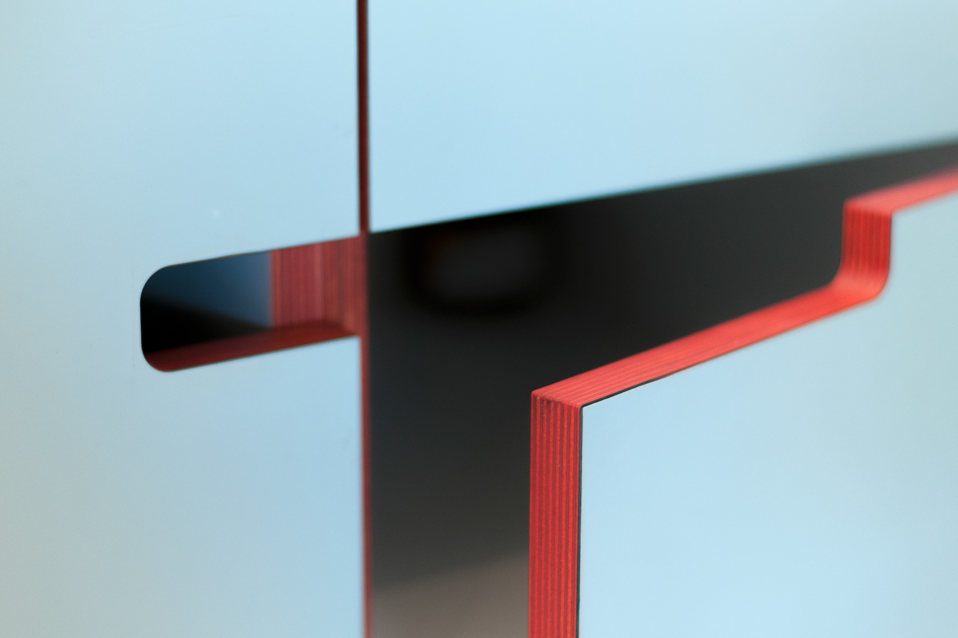 Bij deze opdracht hebben we onze pijlen gericht op materiaal, kleuren en details. De binnenkasten, lades en fronten hebben randen die normaal altijd het minst mooie deel van het plaatmateriaal zijn. Deze hebben wij een volle rode kleur gegeven.