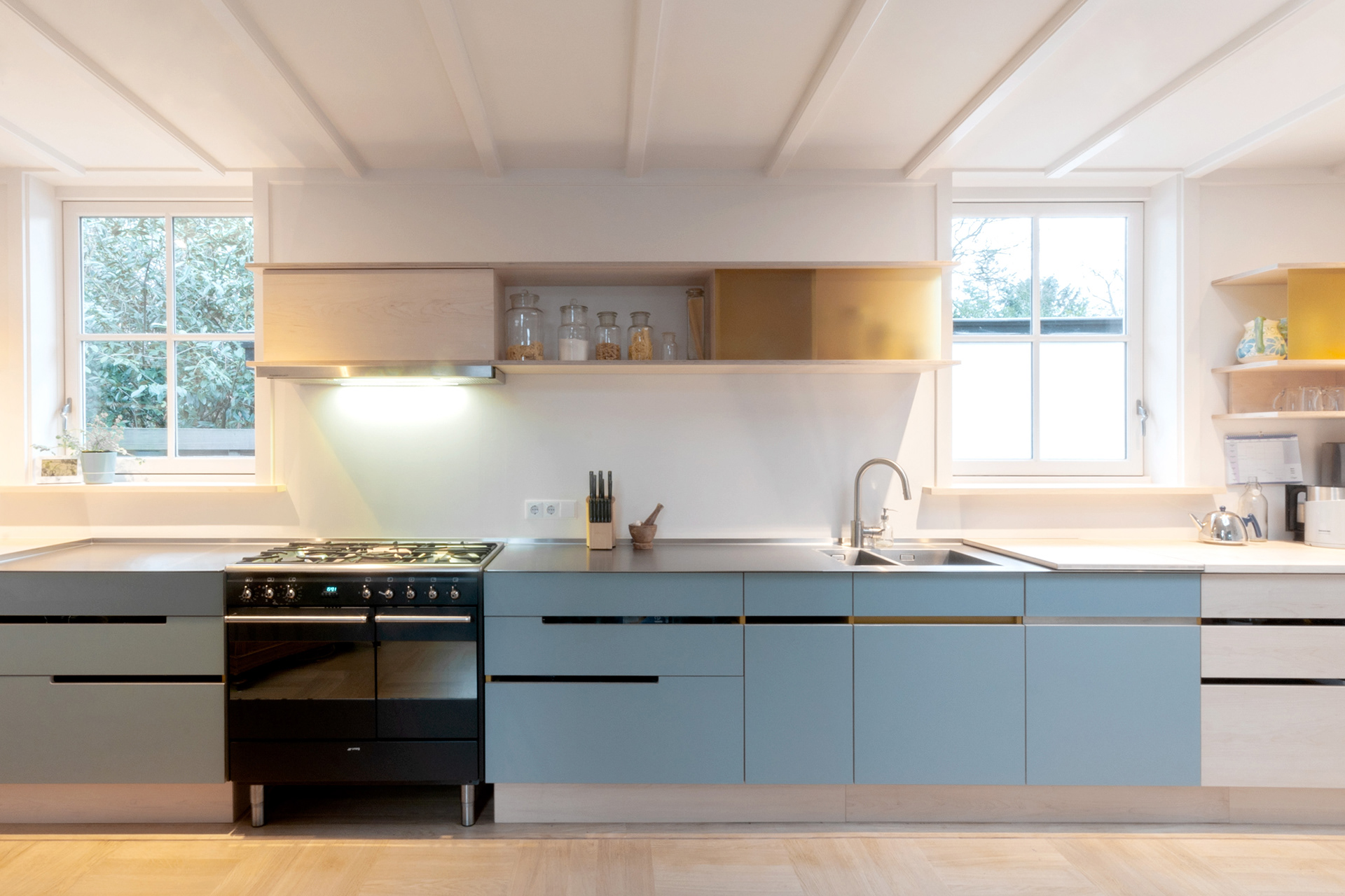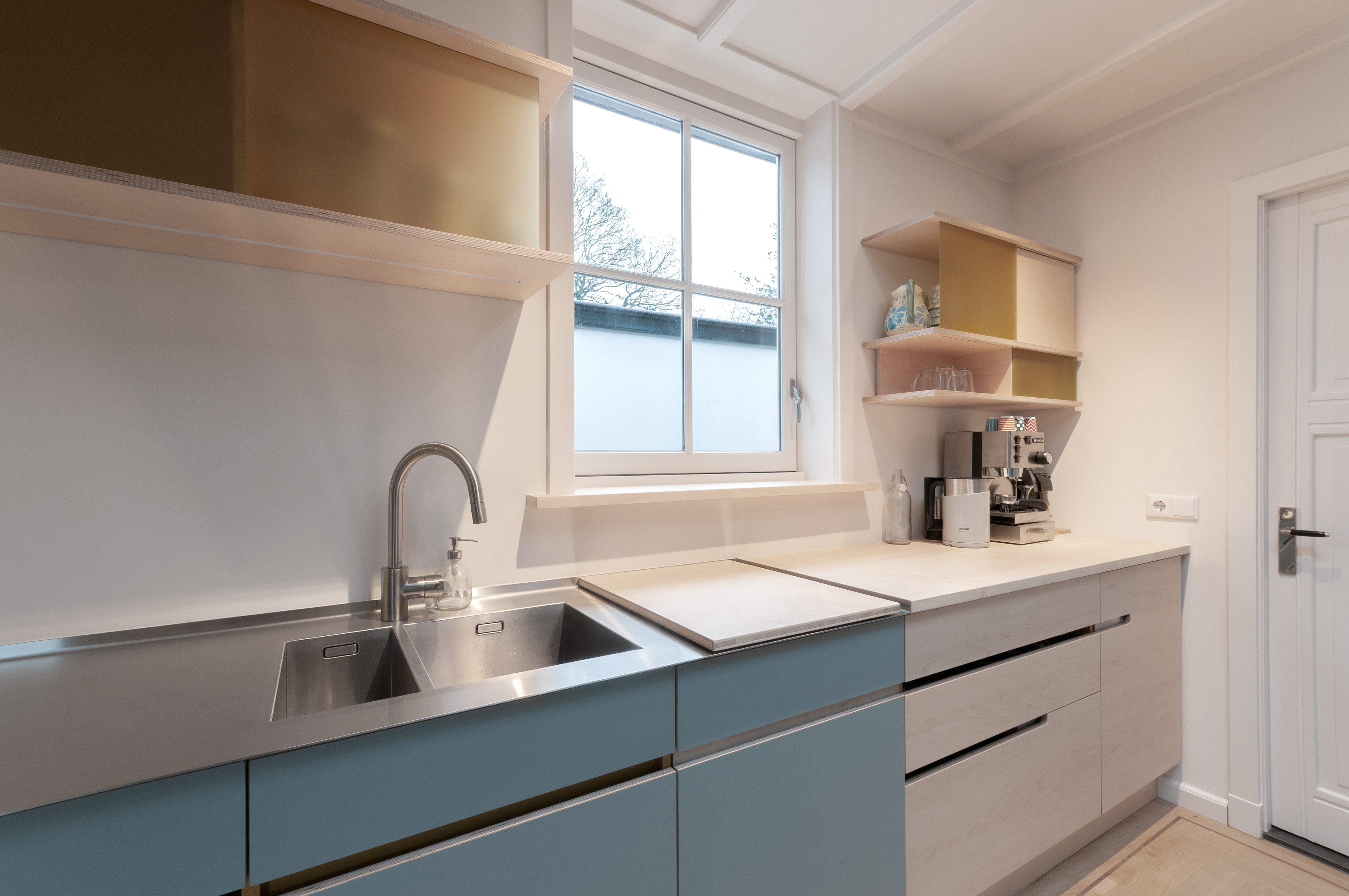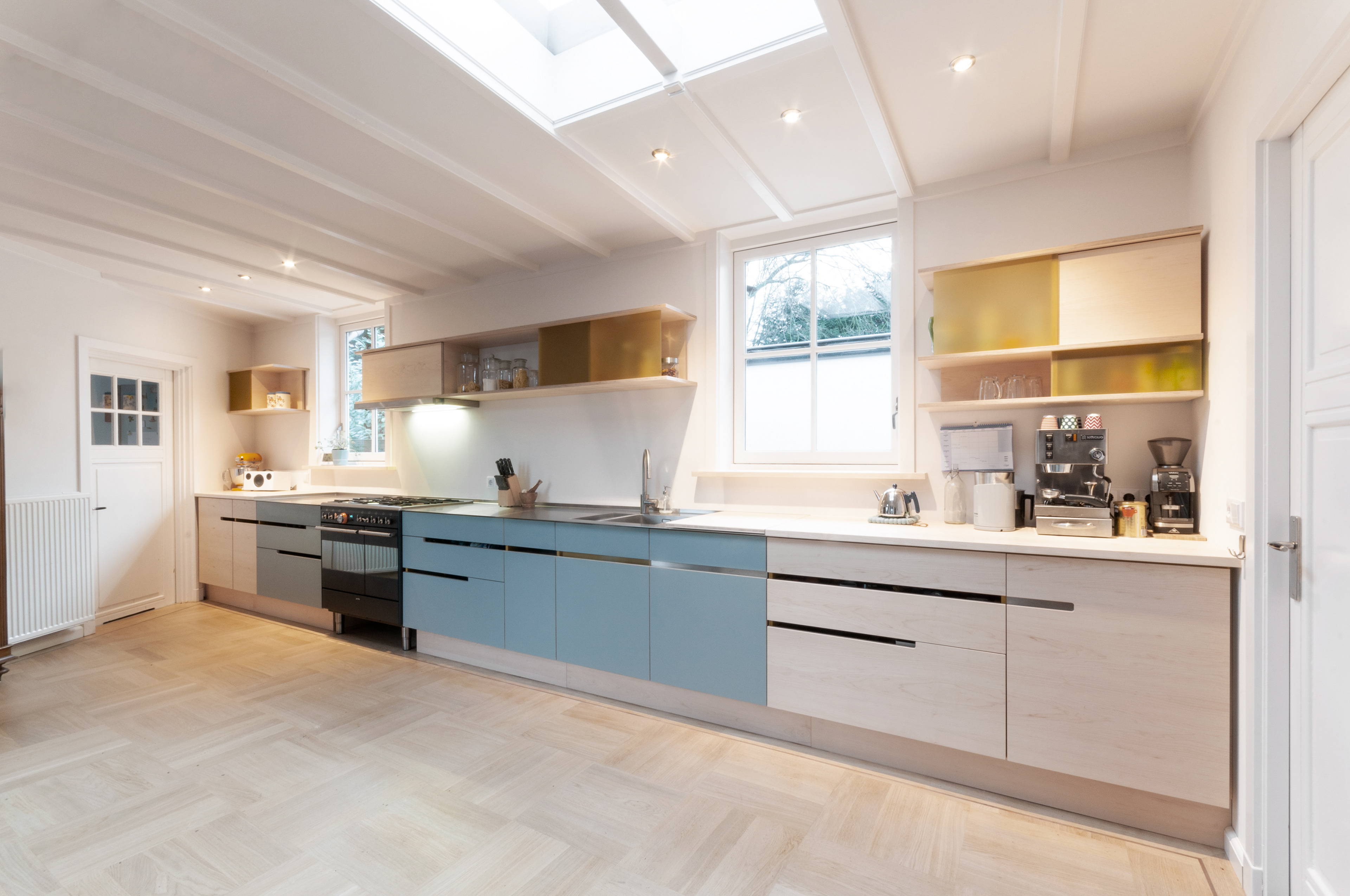 De verdeling van functies hebben we terug laten komen in het uiterlijk: verschillende materialen voor het werkblad en de fronten. In het gebruik springt het gele binnenwerk van de kasten en de lades af en toe vrolijk naar buiten. We zijn erin geslaagd om zowel de lengte van de keuken te benadrukken en tegelijk deze zo op te knippen dat de ruimte in balans is en er echte plekken zijn ontstaan.